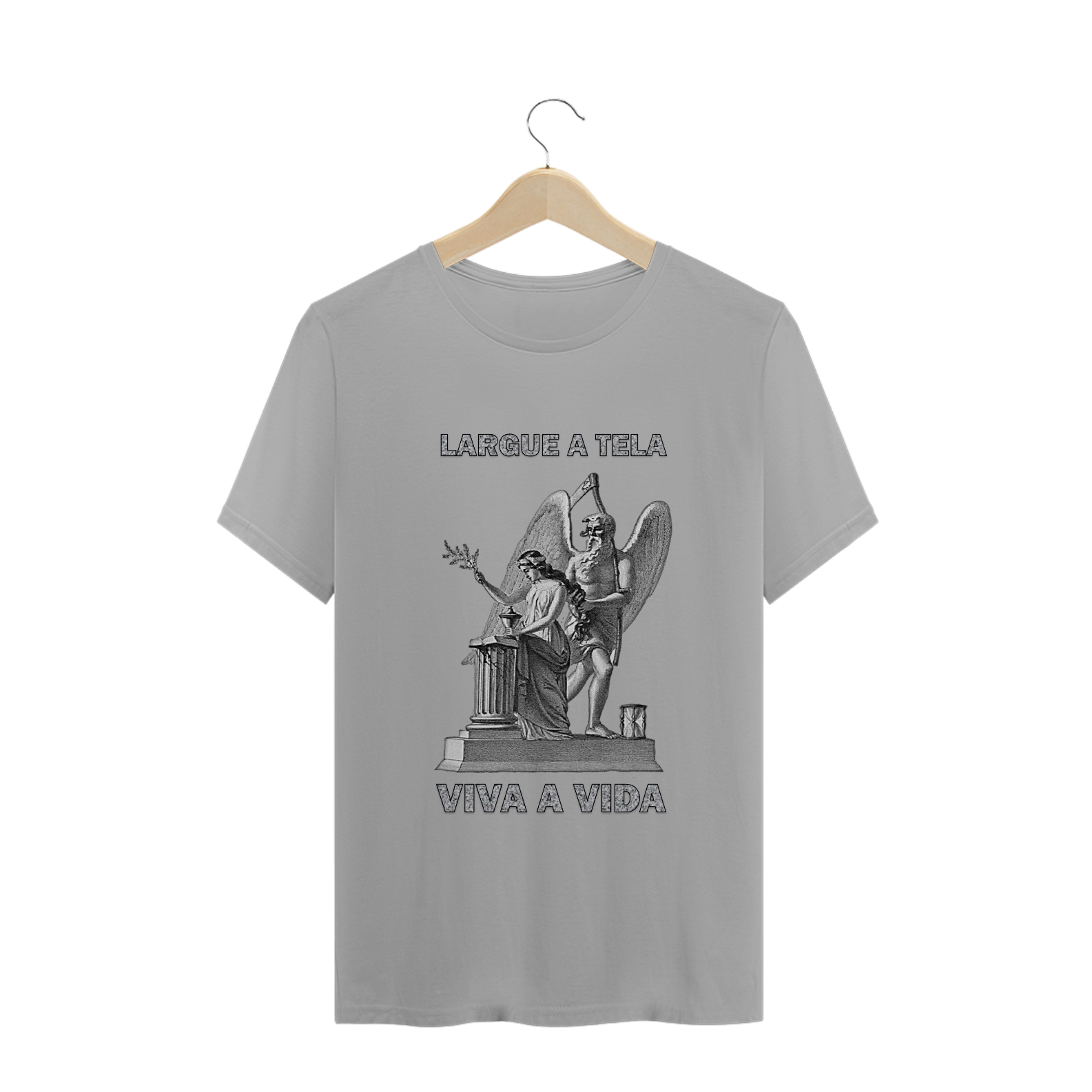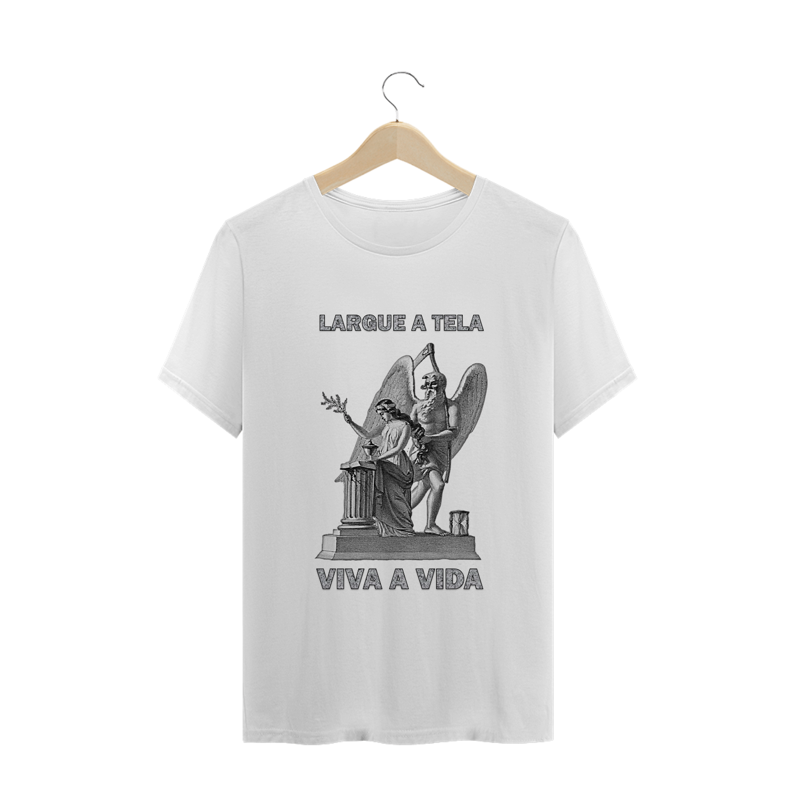 Camiseta VIVA A VIDA, traz a imagem "O Tempo e a Virgem", que apresenta os símbolos da Coluna Quebrada, da Jovem Mulher segurando um Ramo de Acácia, do Pai Tempo, com a Ampulheta e a Foice, e do Livro da Vida. Passa a mensagem de que a vida terrena é curta, cujo fim é inesperado, mas sempre chega para todos. Então, deixemos um pouco o celular, o computador e a televisão de lado e que possamos desfrutar um pouco das belezas e bençãos da vida!